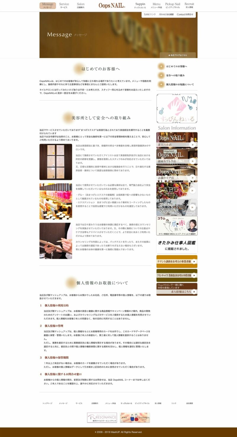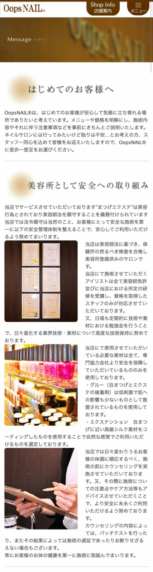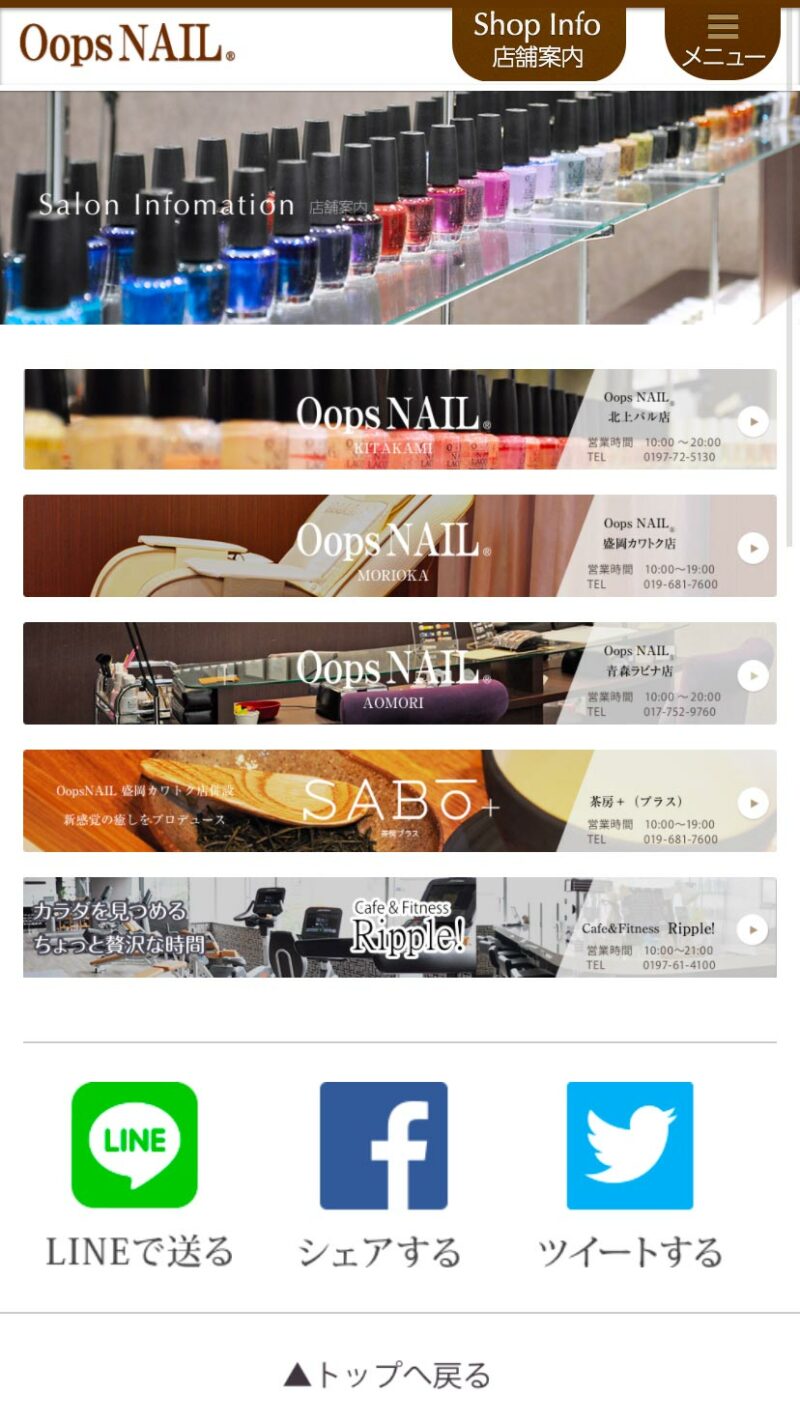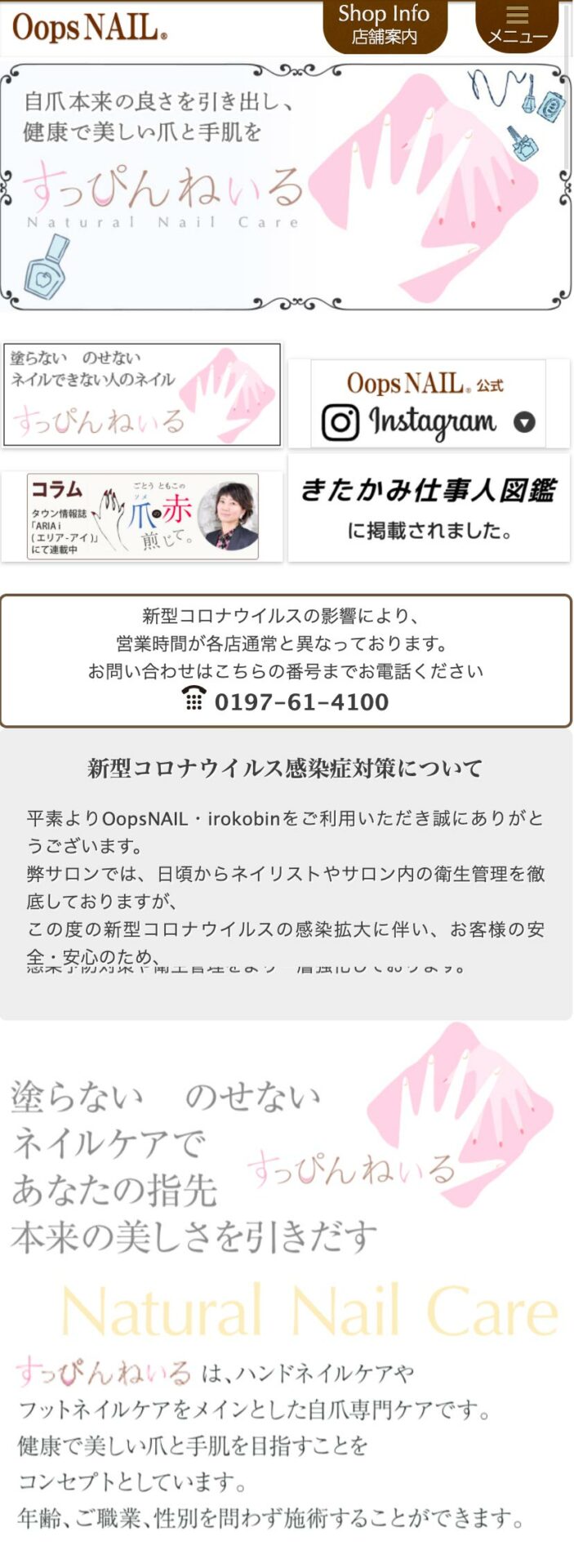 Oops NAIL® 様 URLhttp://www.oopsnail.com/ 地域・業界・業種 北上市 / ネイルサロン デバイス・仕様PC、スマートフォン、NucleusCMS 担当業務等Webサイト設計/情報設計/デザイン/CMS構築/更新操作指導