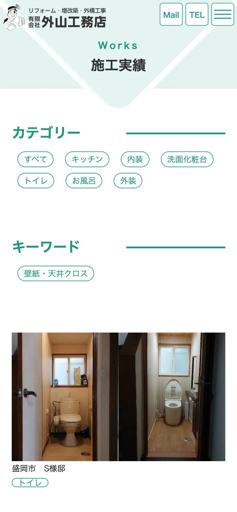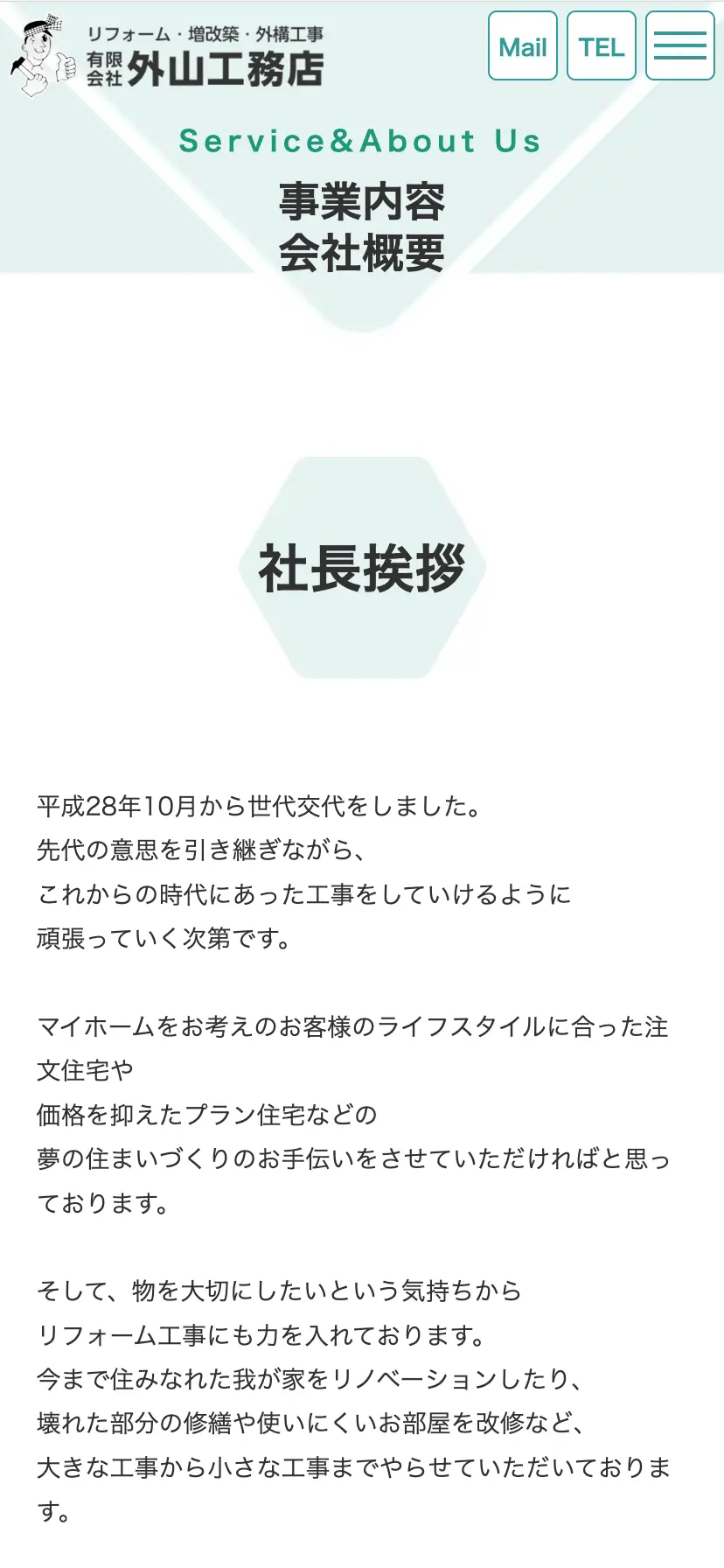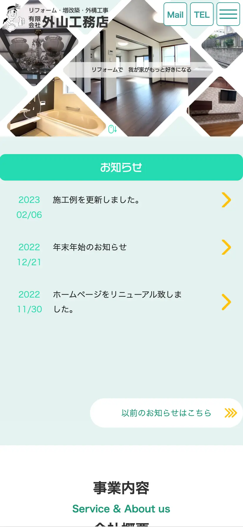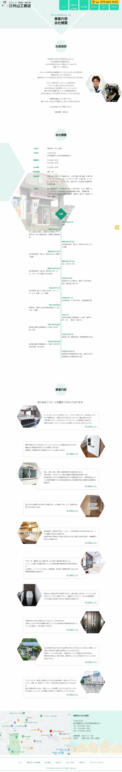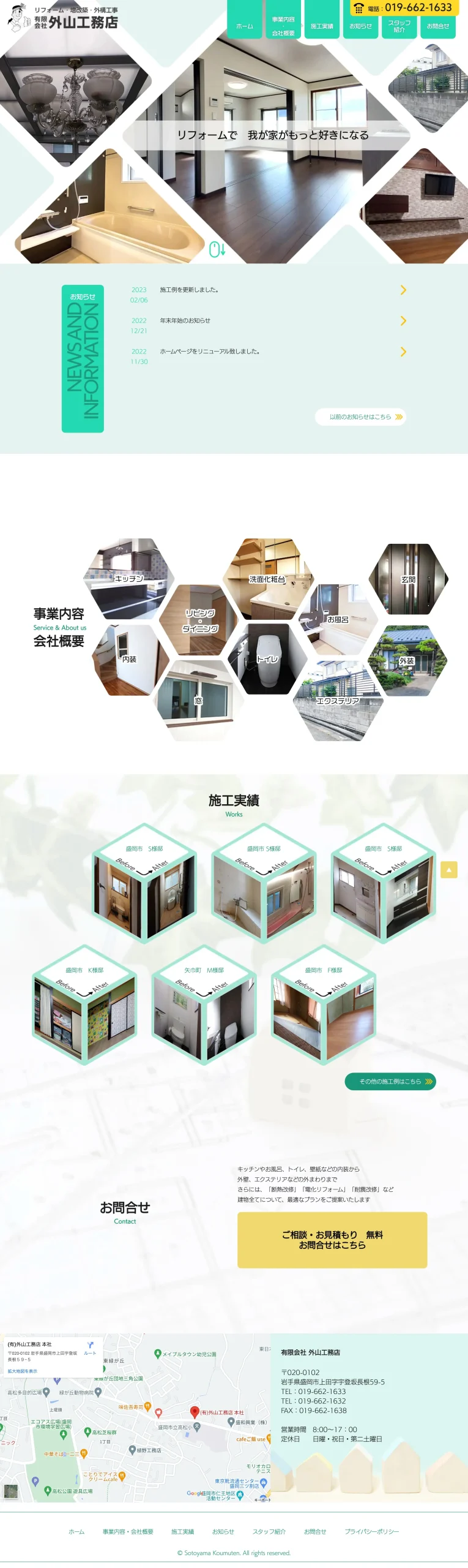 有限会社 外山工務店 様 内装や水回り、外装、さらにはエクステリアまで、規模の大小に関わらずさまざまなリフォームに幅広く対応していることから、複数の施工例写真をタイル状に敷き詰めて掲載。 下に続く、「事業内容/会社概要」部分でも、施工場所の写真を多数掲載。 多数の写真を使用することで自ずと賑やかな雰囲気になるため、配色は白地にミントグリーンを使用し落ち着きのある雰囲気にまとめました。 また菱形や六角形をレイアウトに使用することで、他のサイトと差別化。より印象に残りやすくなると考えます。 URLhttp://sotoyama.info/ 地域・業界・業種 盛岡市 / 工務店 デバイス・仕様PC、スマートフォン、WordPress 担当業務等Webサイト設計/情報設計/デザイン/CMS構築/更新操作指導